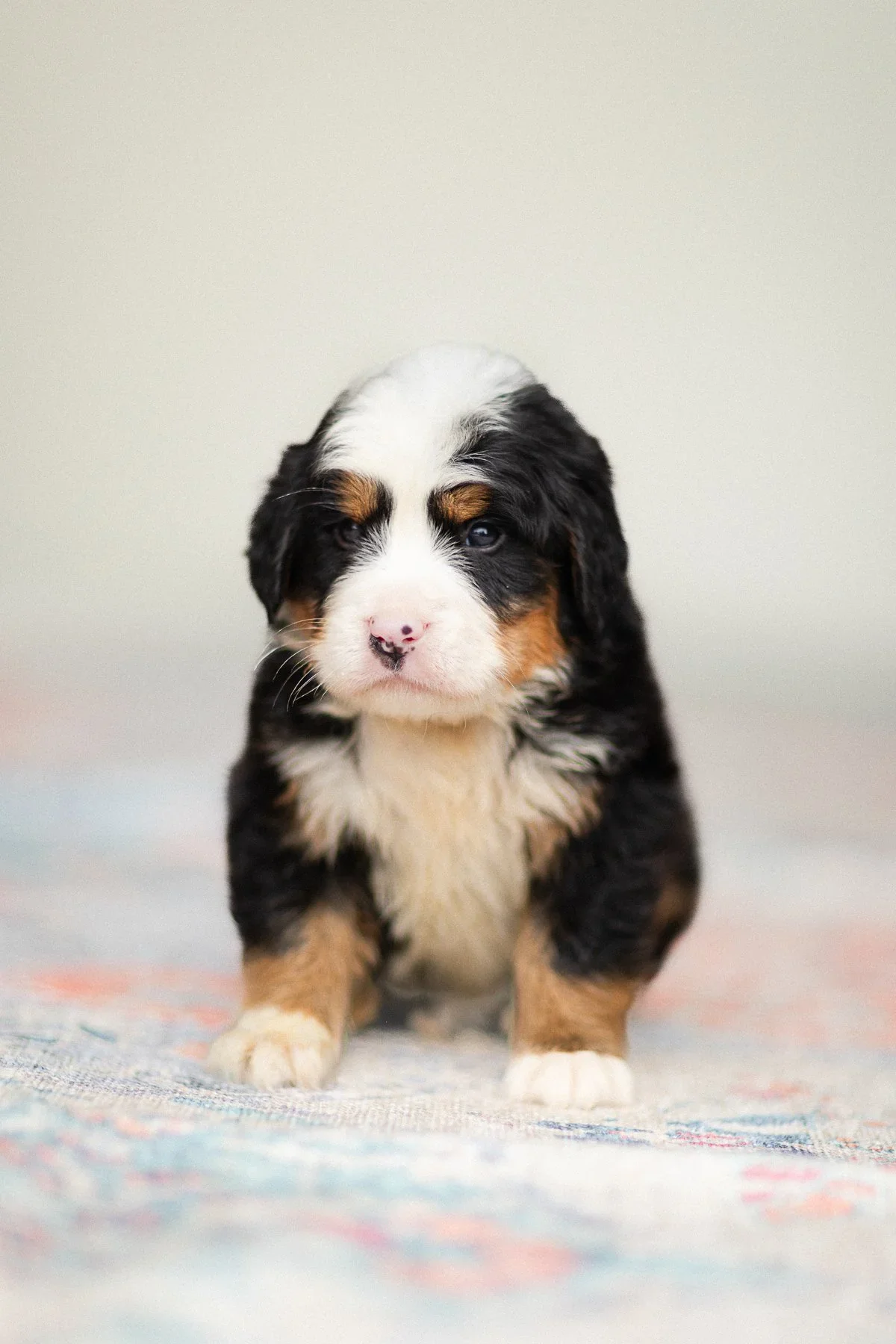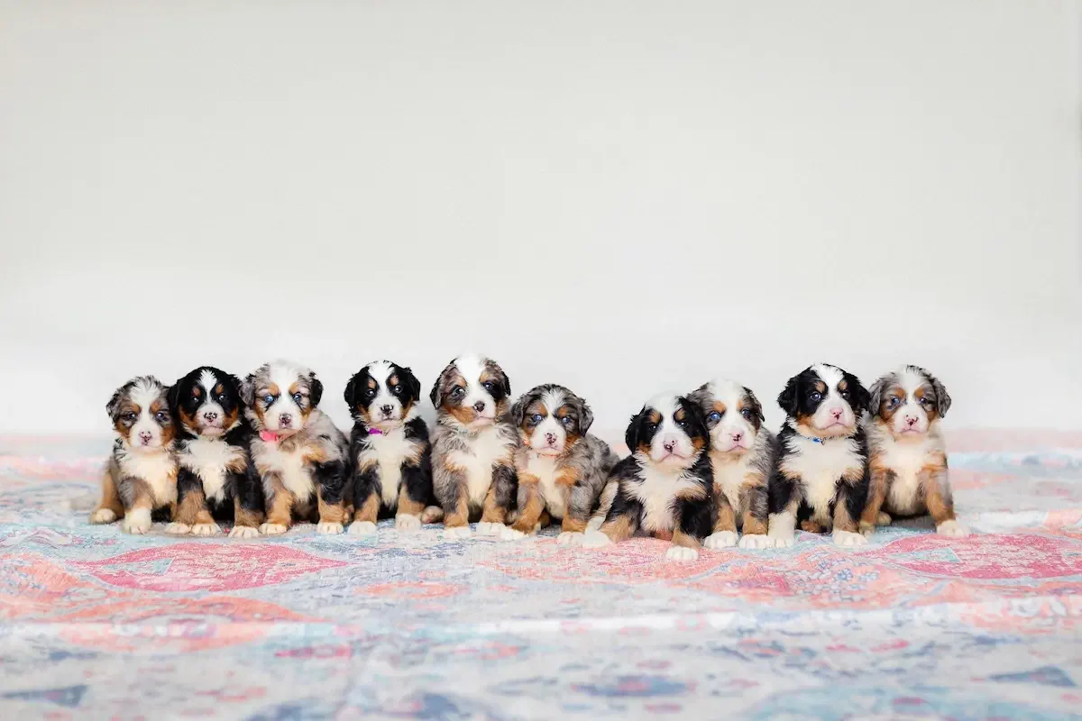Very similar to that of a Bernese and an Australian Shepherd. These dogs have a softer wavier coat than a purebred Aussie. These dogs will shed but will have lovely silky tri-merle coats.