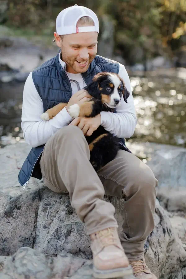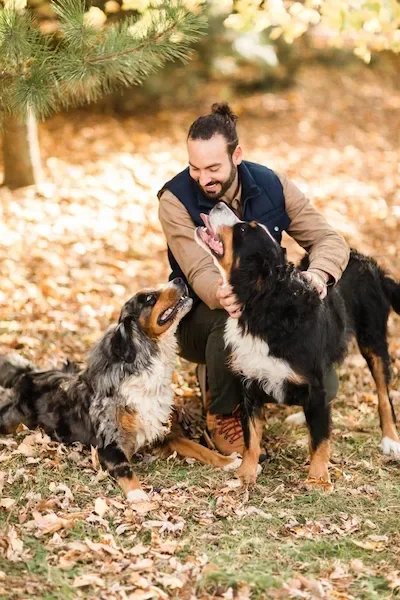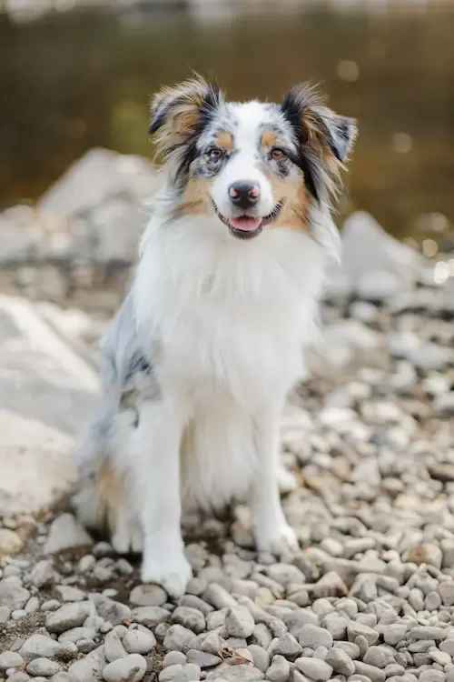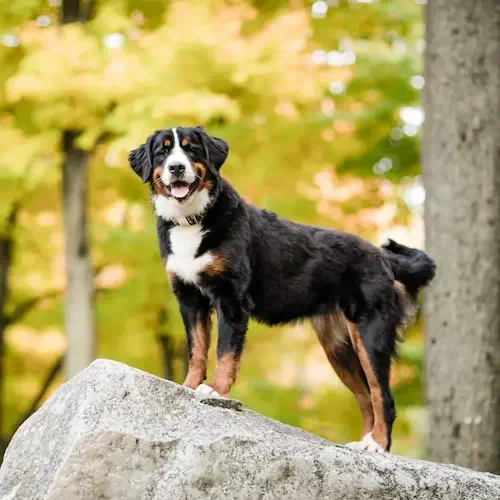“A cross between an Australian Shepherd and a Bernese Mountain Dog. They are large and stunning dogs that naturally inherit their parent breeds’ personalities.”