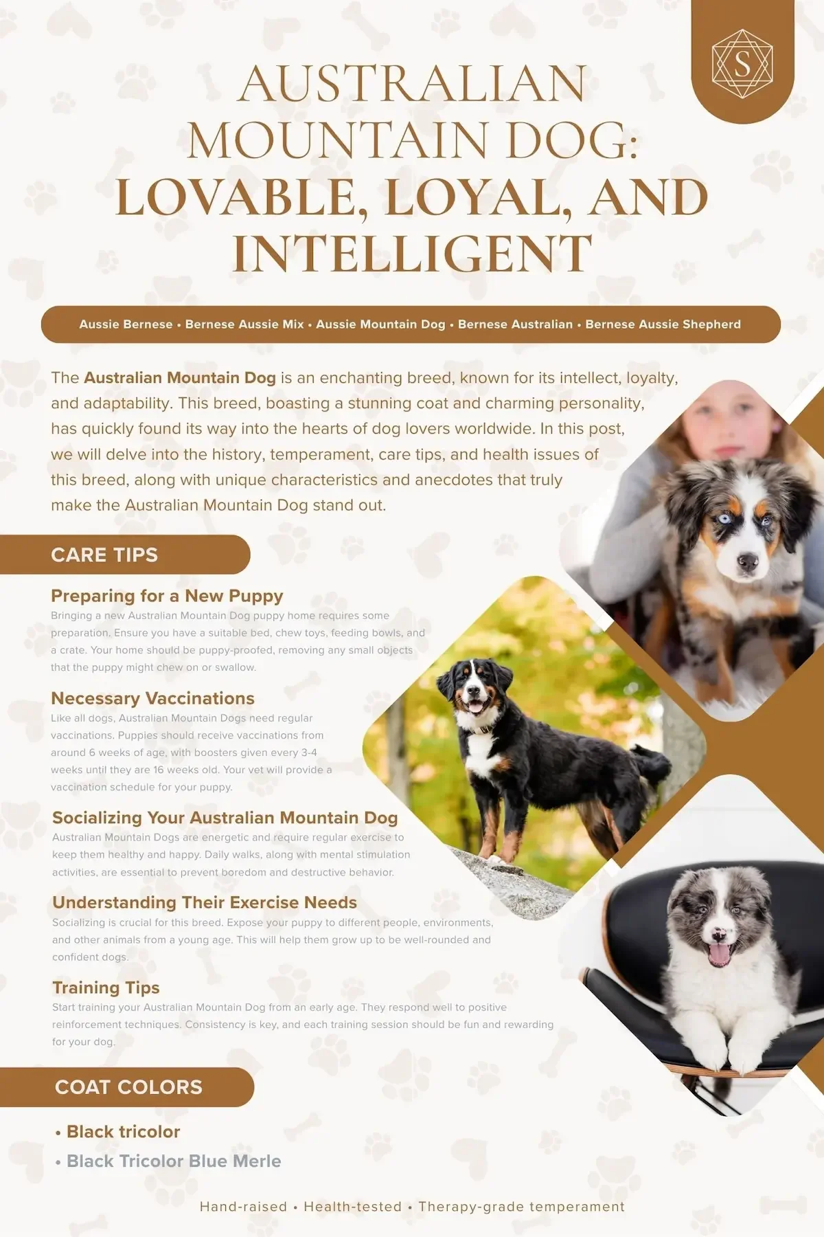 The Australian Mountain Dog is the perfect blend between a laidback Bernese, and a sporty emotionally attuned Australian Shepherd revered for their beautiful tricolored merled coats.