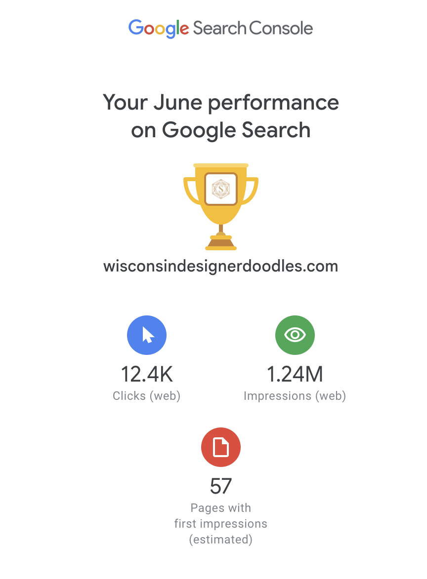 In June alone, wisconsindesignerdoodles.com earned 1.24 million impressions and 12,400 website clicks across Google Search — with 57 pages gaining first-time visibility. This level of organic reach proves our brand stands out in a crowded space, driving qualified, engaged traffic without paying for ads.