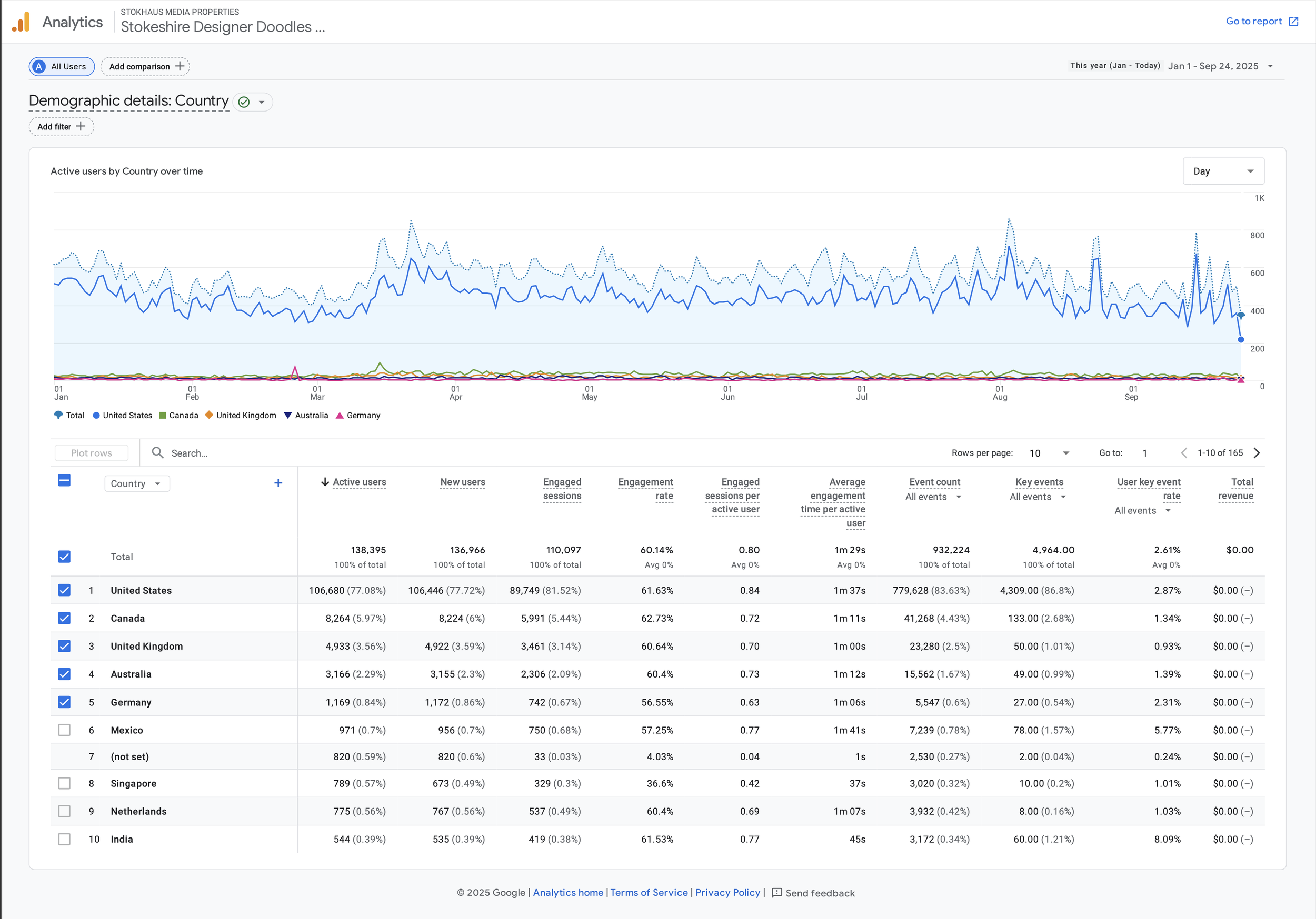 When you partner with Stokeshire Designer Doodles, your brand is introduced to a highly qualified, purchase-ready community of dog lovers. Nearly 140,000 active users have visited our site this year — most arriving through organic search — and more than 60% engage deeply with our content. U.S. visitors, who make up 77% of our audience, spend 1½ minutes per session exploring trusted recommendations and premium products.