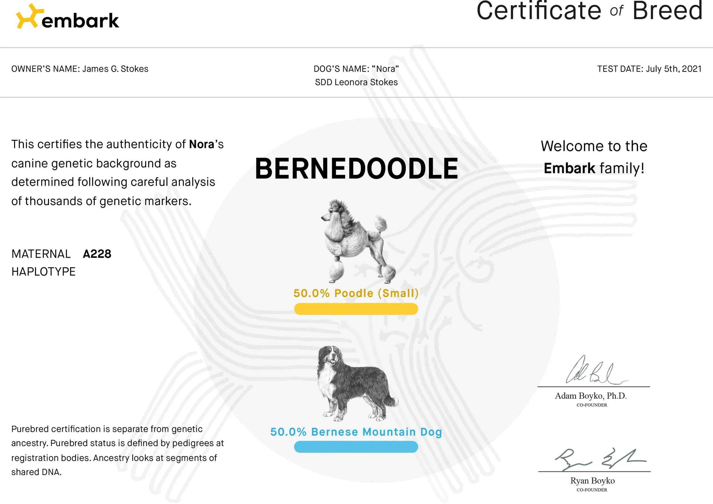 The Bernese Mountain Dog, one of the parent breeds of the Bernedoodle, is known for a shorter lifespan and higher rates of autoimmune issues. At Stokeshire, we keep the COI under 10% in our litters to reduce the risk of inherited disorders.