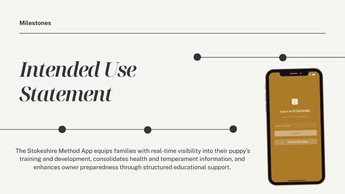 The app's intended use is clear: to provide families with real-time visibility into their puppy’s training, consolidate all essential information, and enhance owner preparedness. By doing so, it reduces emotional friction and builds the trust that is central to the Stokeshire brand.